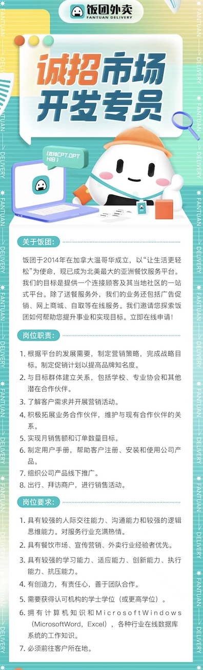 饭团是一家北美互联网生活服务公司,旗下业务包括饭团外卖、饭团点评、饭团跑腿等,结合中式优质服务与北美